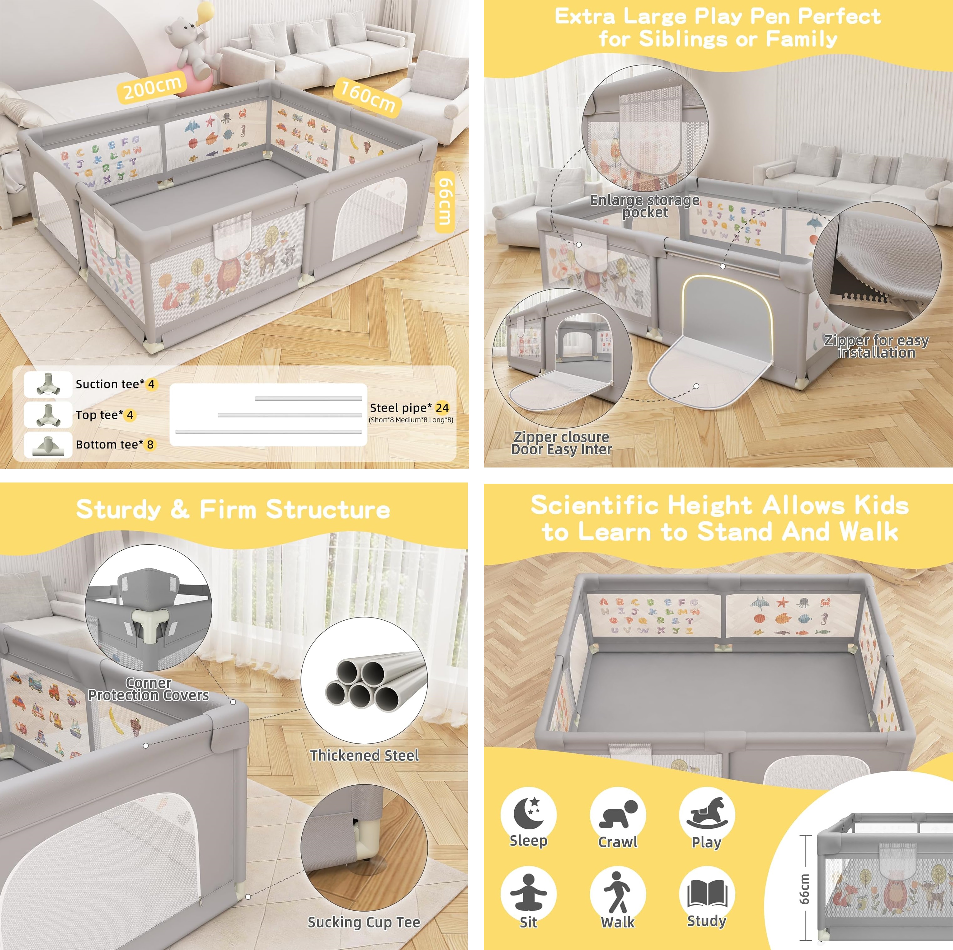 Przestronny plac zabaw o wymiarach 200 cm x 160 cm zapewnia mnóstwo miejsca na zabawki, towarzyszy zabaw, a nawet zwierzęta, zapewniając im swobodę ruchu. Wysokość 66 cm została zaprojektowana tak, aby zapewnić Twojemu dziecku swobodę wstawania i stawiania pierwszych kroków, a solidna siatkowa konstrukcja zapewnia bezpieczeństwo.