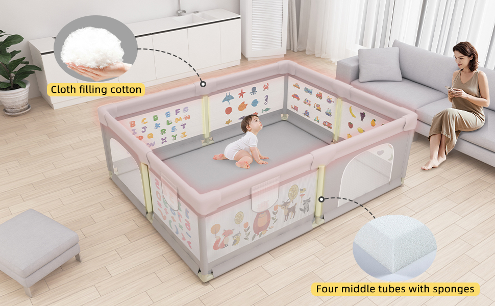 Nasz kojec posiada miękką osłonę ochronną na górne stawy, która nie tylko zapobiega uderzaniu dziecka o stawy podczas zabawy, ale jest również łatwa w czyszczeniu. Ta dodatkowa funkcja ułatwia utrzymanie czystości i higieny.