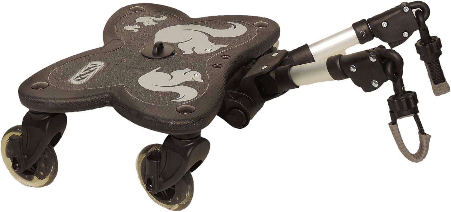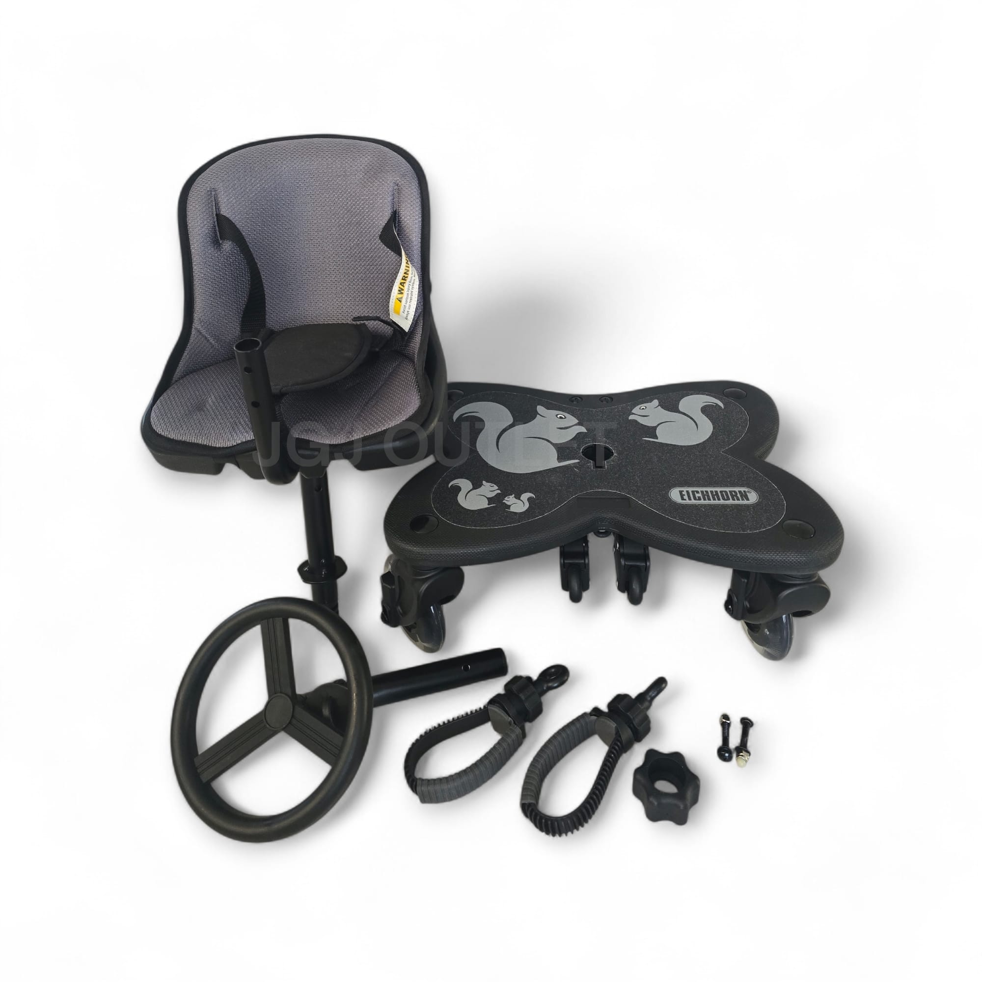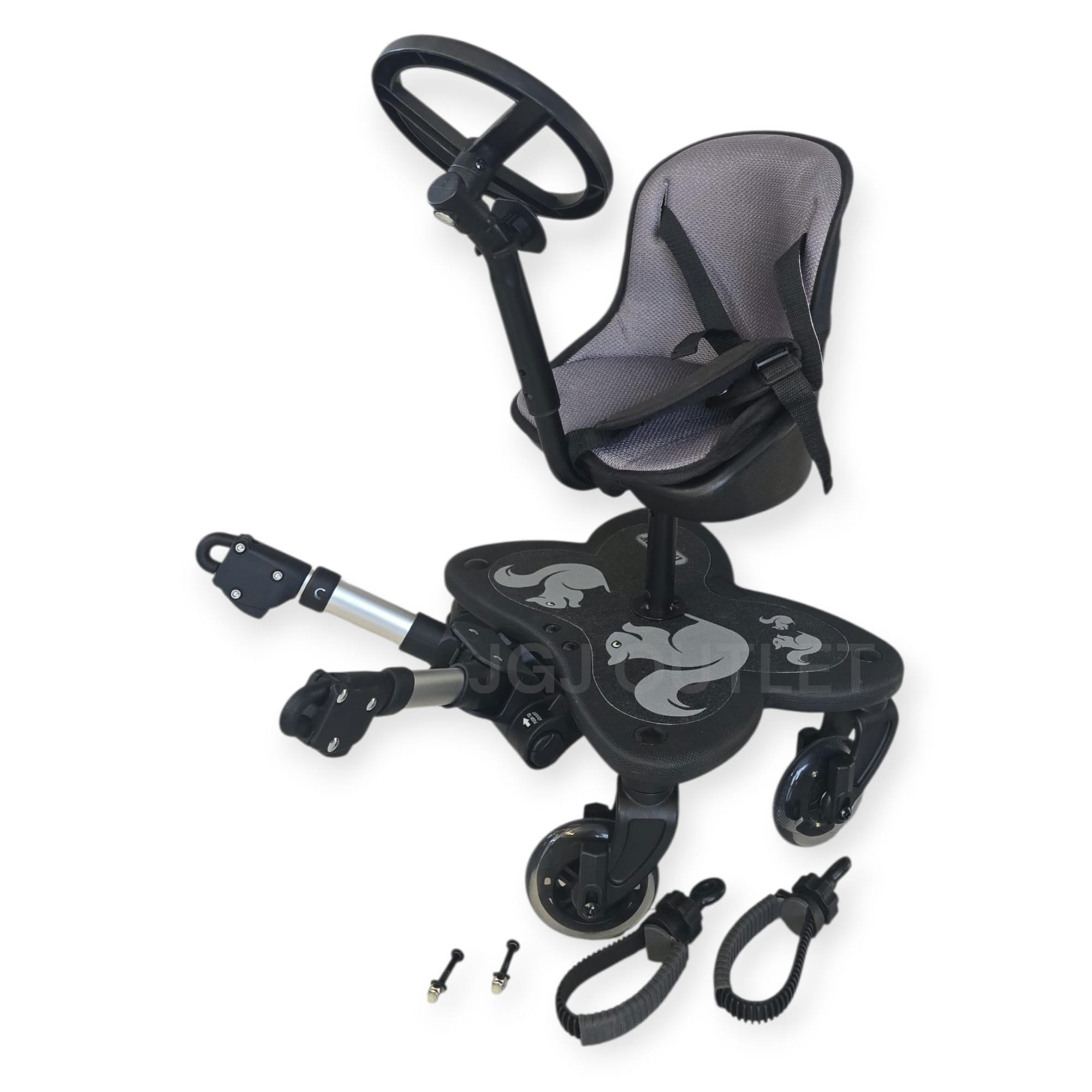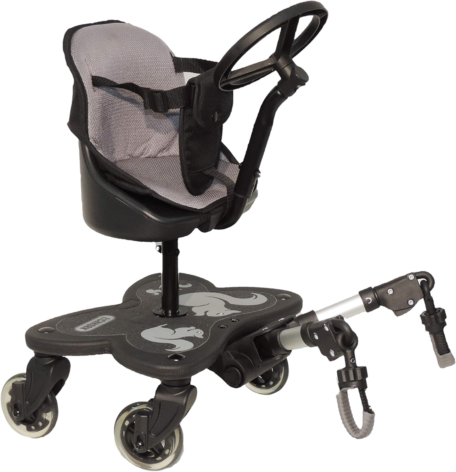 Cozy C-Rider z siedziskiem i kierownicą (wyposażony w ulepszony, jeszcze łatwiejszy system mocowania - następca popularnego Cozy B-Riders!) Przeznaczony dla małych dzieci w wieku od 15 miesięcy (do 25 kg), które już siedzą w podróży na dłuższych trasach jeszcze nie mogą stać przez długi czas. Po wyrośnięciu "małego pasażera" z siedzenia (powierzchnia siedziska 19 cm) można go zdjąć i dalej używać deski w pozycji stojącej. Powłoka antypoślizgowa z uroczym nadrukiem wiewiórek, zapewnia stabilność.