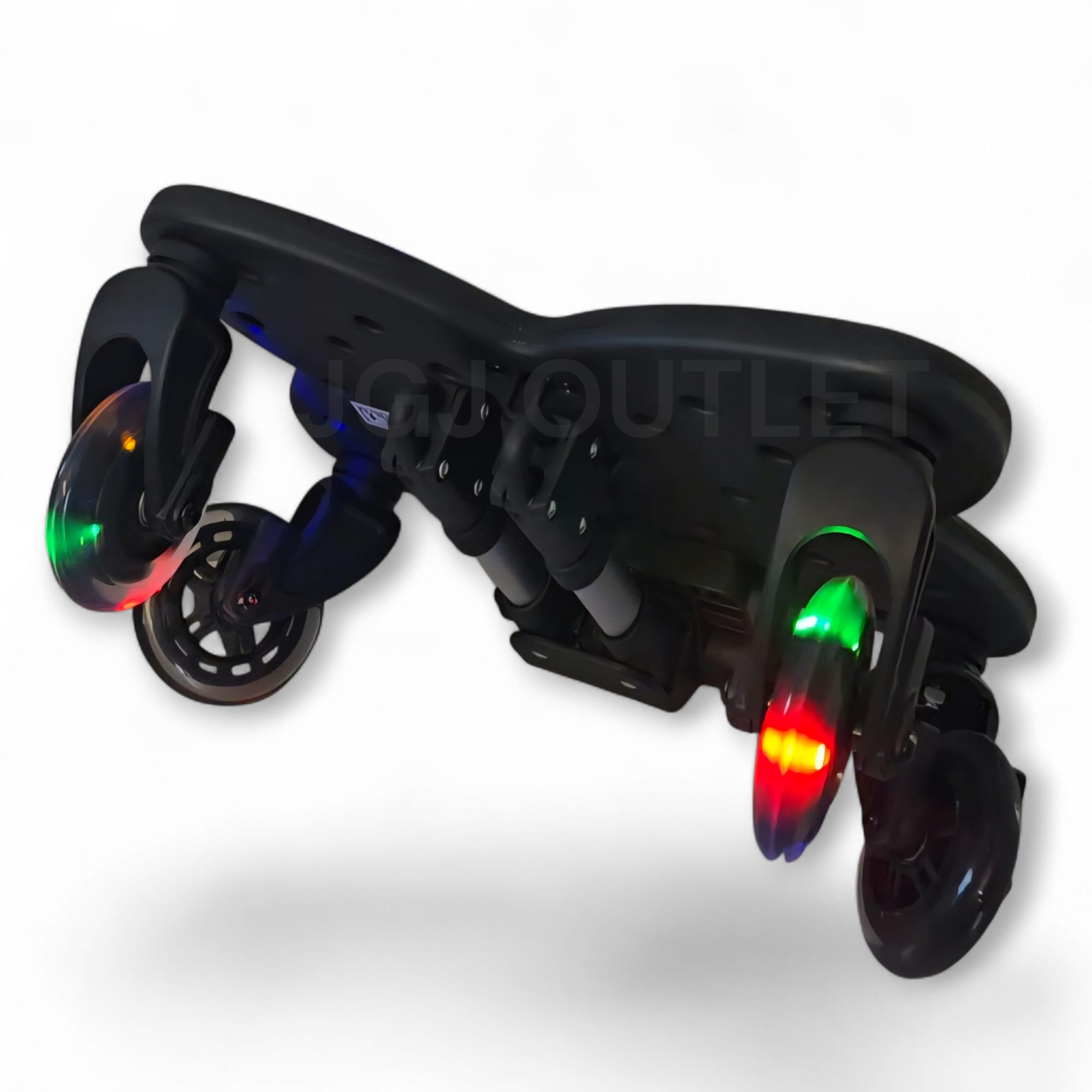 Instalacja Rider jest prosta, a Rider można łatwo zaczepić i ponownie zaczepić do uchwytów mocujących, które mogą pozostać na ramie wózka dziecięcego, dzięki czemu Rider można w mgnieniu oka zdjąć i ponownie zamocować, kiedy jest potrzebny. Kolorowe migające tylne koła zapewniają większe bezpieczeństwo w ruchu drogowym (np. o zmierzchu) i zachwycają nie tylko dzieci: koła migają automatycznie.