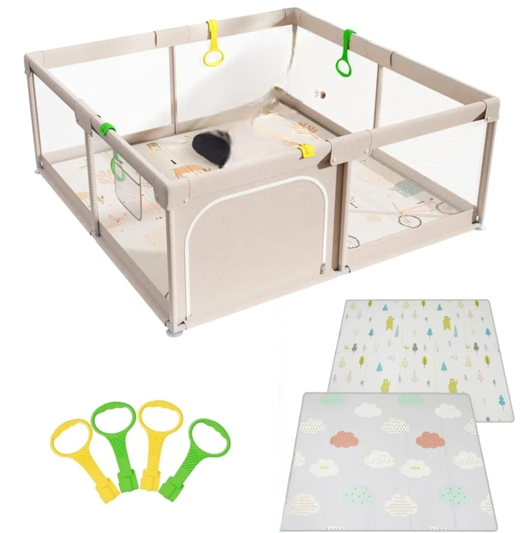 Kojec dla dzieci PLAYPEN 150x150 cm o wysokość 59 cm z matą i 4 obręczami do trzymania