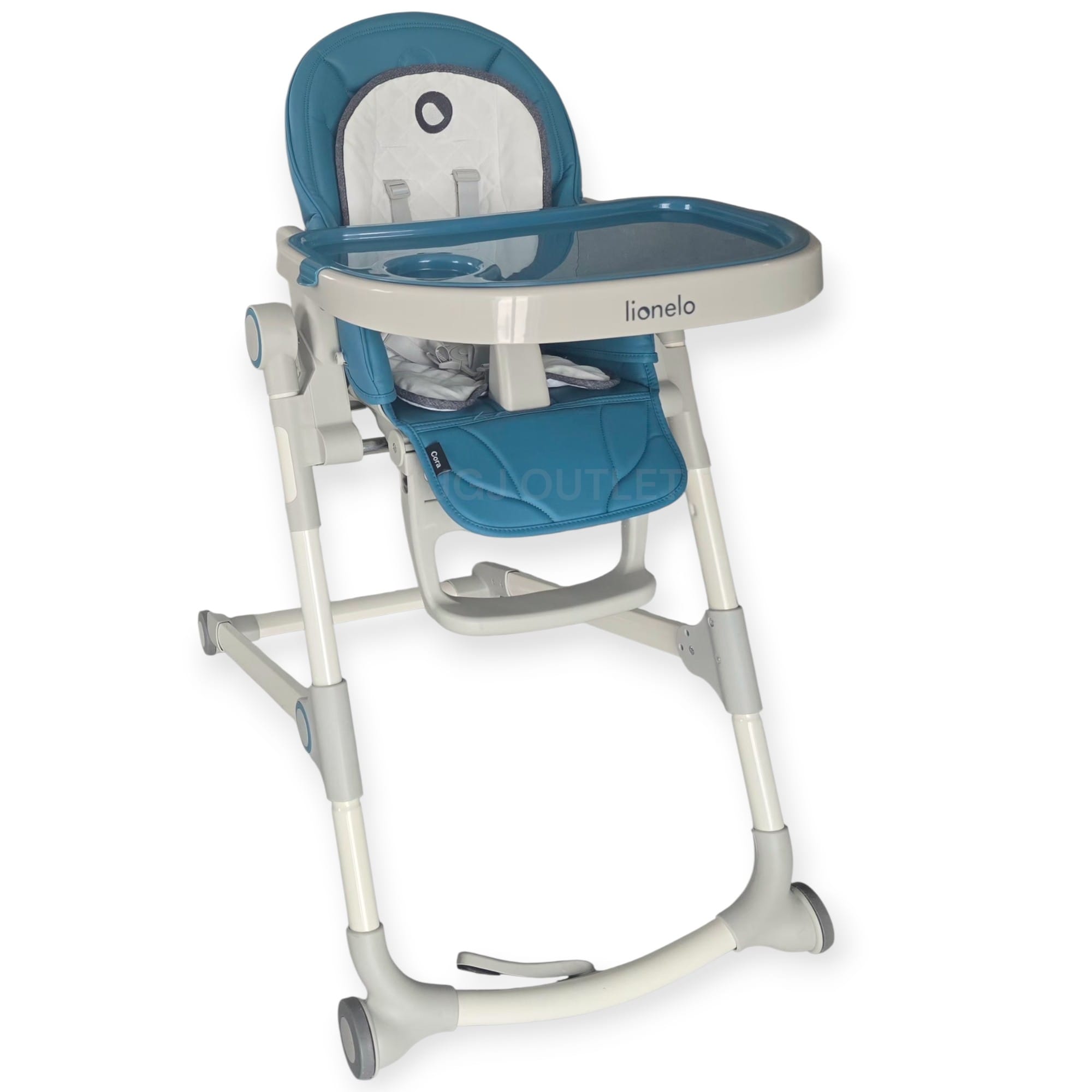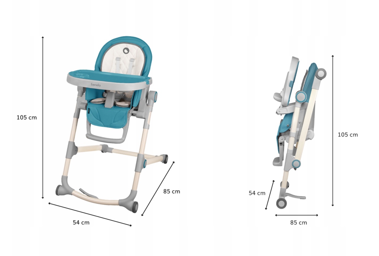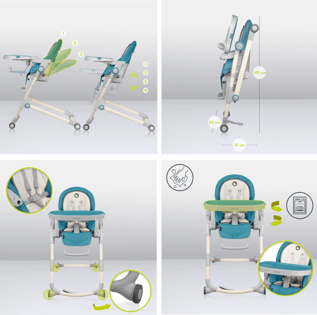 - Krzesełko jest bardzo łatwe w utrzymaniu czystości, dzięki zastosowaniu eko-skóry oraz rozkładanej tacce z możliwością 2-stopniowej regulacji, która nadaje się do mycia w zmywarce.