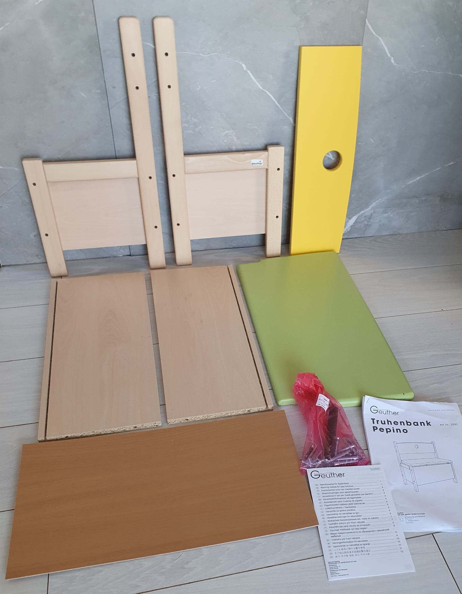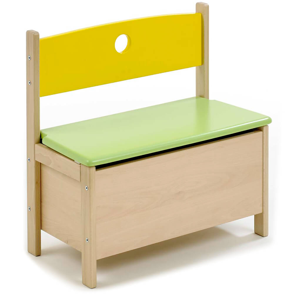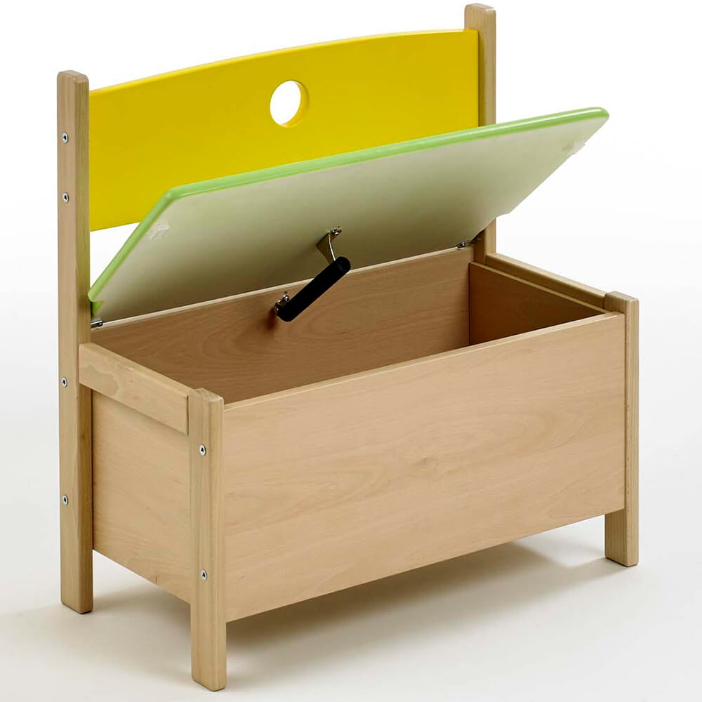Na tej praktycznej ławce z oparciem można nie tylko usiąść, ale można ją również otworzyć i oferuje dużo miejsca do przechowywania. Hamulec pokrywy zapobiega opadaniu pokrywy i ściskaniu palców dziecka.