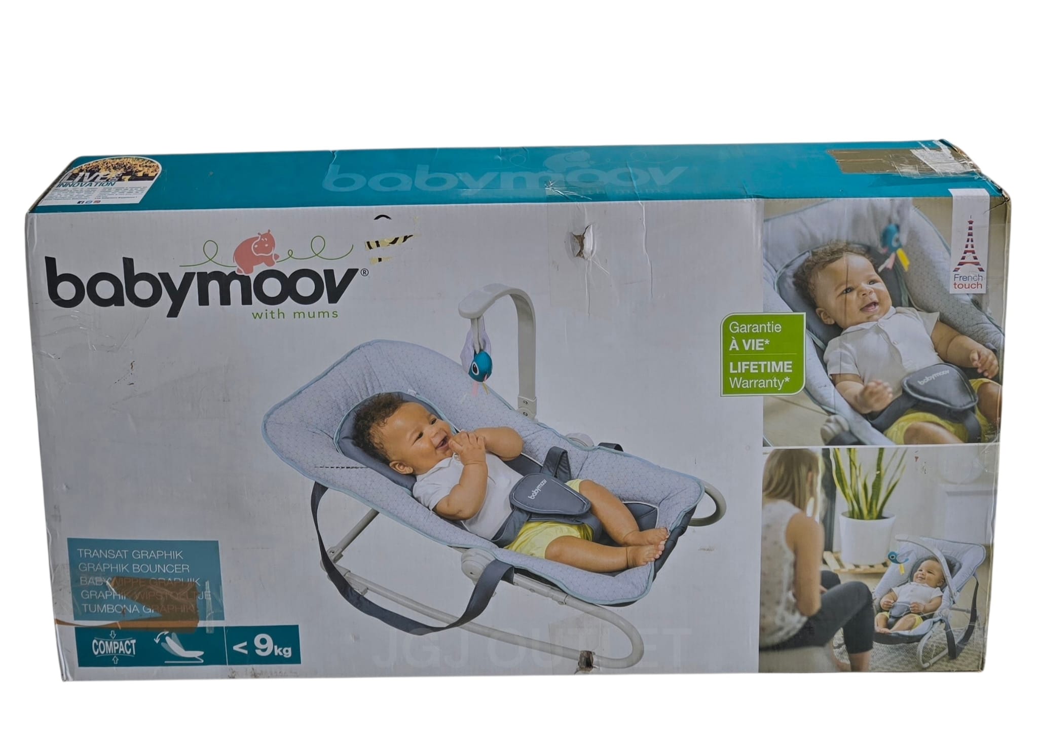 Bujaczek Graphik oferuje miękkie, kokonowe i pikowane siedzisko dla wygody dziecka od urodzenia. Zaprojektowany, aby dostosować się do kształtu ciała dziecka i wyposażony w zdejmowaną i regulowaną podpórkę pod głowę, bujaczek Graphik zapewnia dziecku dobre wsparcie. Można używać tego bujaczka w stałej pozycji lub jako bujaczka (bez silnika). Oparcie odchyla się do różnych pozycji, podobnie jak łuk z zabawką. Bujaczek składa się do kompaktowych rozmiarów i posiada uchwyty do przenoszenia, dzięki czemu można go łatwo zabrać ze sobą w drogę. Pokrowiec bujaczka Graphik jest zdejmowany i można go łatwo wyprać ręcznie, podobnie jak zagłówek i element do zabawy.