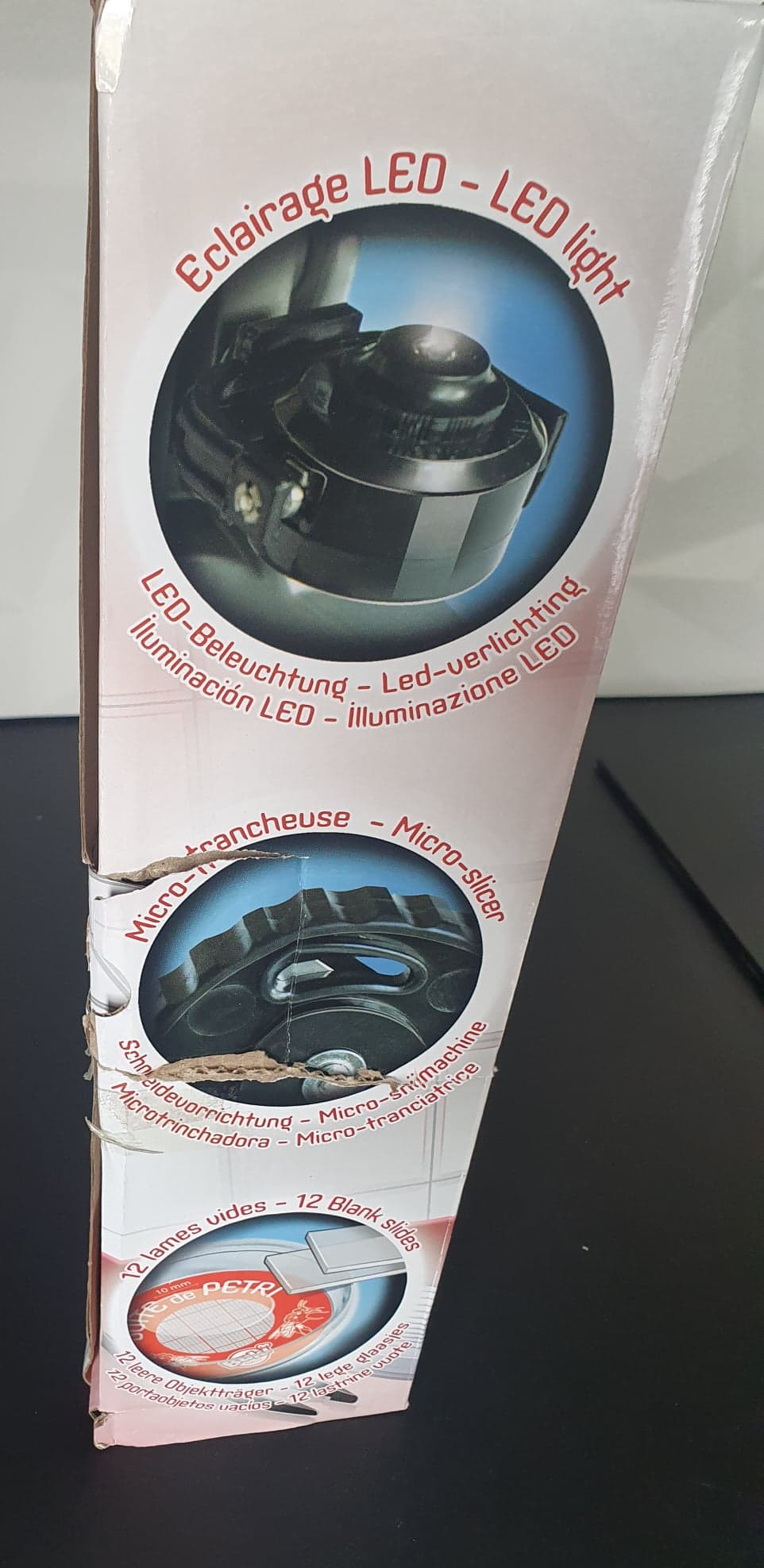 Mikroskop o wysokości 23 cm. z soczewkami, kolorowymi filtrami oraz 3 powiększeniami: x200, x600, x1200.