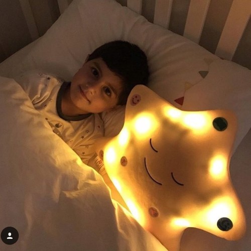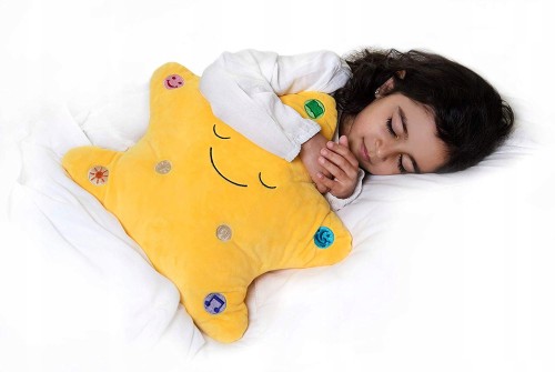 Poduszka ma 35 cm x 35 cm i została wyposażona w fajne światła LED, które zapewniają kojący blask przed snem - a diody LED wyłączają się automatycznie po 15 minutach! Użyj regulacji głośności, aby ustawić idealną głośność .