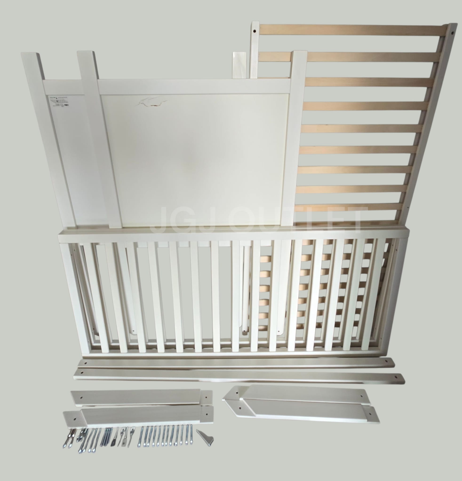 Białe łóżeczko dziecięce Roba, wyposażone w stelaż z listew, jedno z dwóch boków wyposażone w 3 praktyczne pałąki zabezpieczające, które można wyjąć i ułatwiają wchodzenie i wychodzenie.
