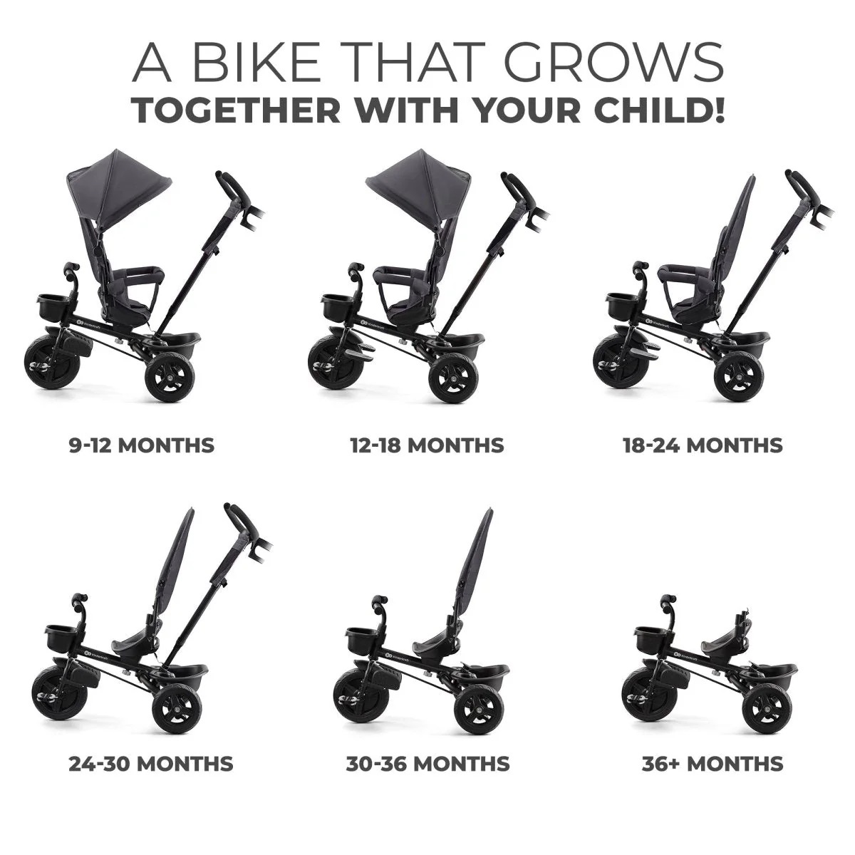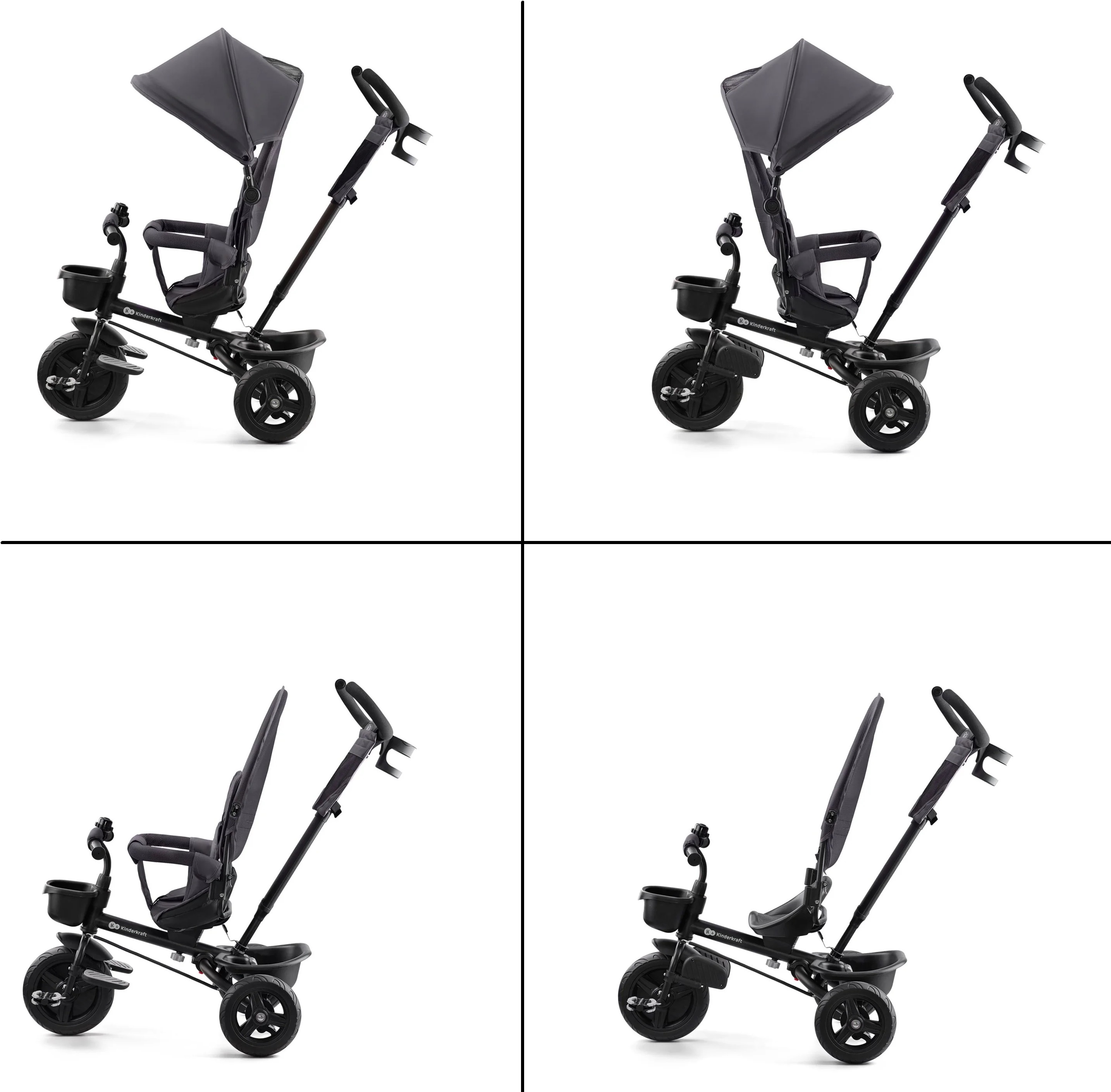 Siedzisko możesz ustawić tak, aby dziecko podróżowało przodem, lub tyłem do kierunku jazdy, lub przesunąć w celu jak najlepszego dopasowania odległości dziecka od pedałów - dzięki temu spacer może być jeszcze bardziej komfortowy i ciekawy!