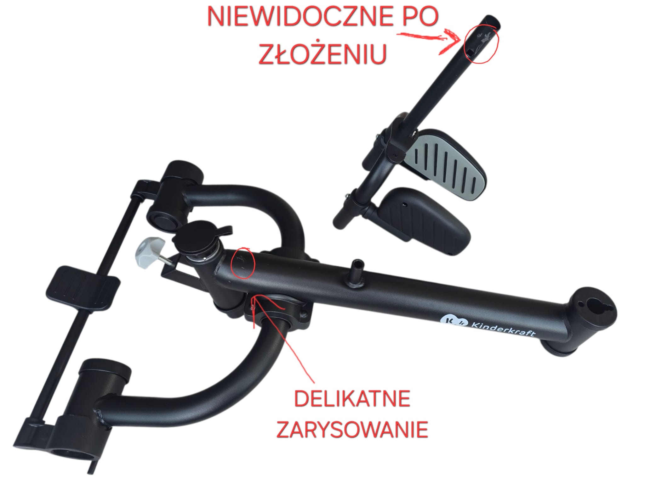TOWAR PO ZWROCIE NOWY – OTWARTY W CELU SPRAWDZENIA ZAWARTOŚCI I DO ZDJĘĆ. OTARCIA NA ELEMENCIE RAMY I OD KIROWNICY NA ŁĄCZNIU (NIEWIDOCZNE PO ZŁOŻENIU) PRZEDSTAWIONE NA ZDJĘCIACIU.