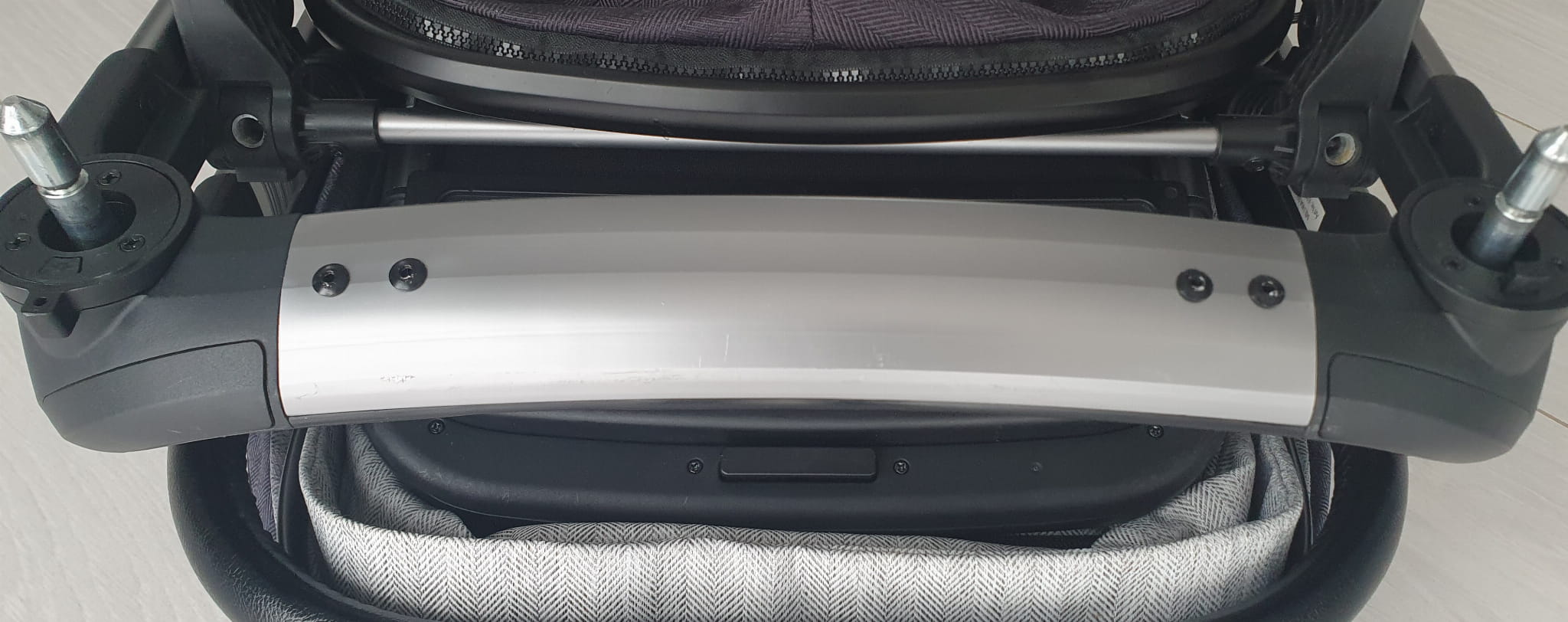 Drobne metaliczne wstawki. Na wielu częściach wózka. m.in na suwakach, podnóżku, daszku spacerówki i koszu na zakupy.